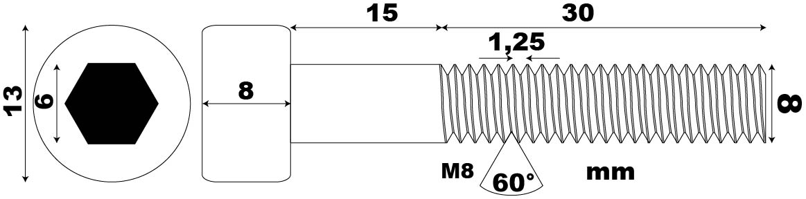 6304- SCREW ALLEN HEAD, M8 THREAD MM 1.25, DIAMETER 8, LENGTH 15, UNI 5931,DIN 912,ISO 4762